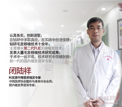科发源华南首席植发专家,毕业于广西医科大学,临床专业,本科学历,学士学位。从事毛发移植研究近十年。曾发表过关于毛发移植技术研究成果,对脱发治疗方面有较深的研究。主要擅长第二代FUE无痕植发技术的究其最大特点是责任心强,对手术一丝不苟,对脱发技术研究不断的创新,曾在国家级、省级杂志上发表整形外科论文10余篇。